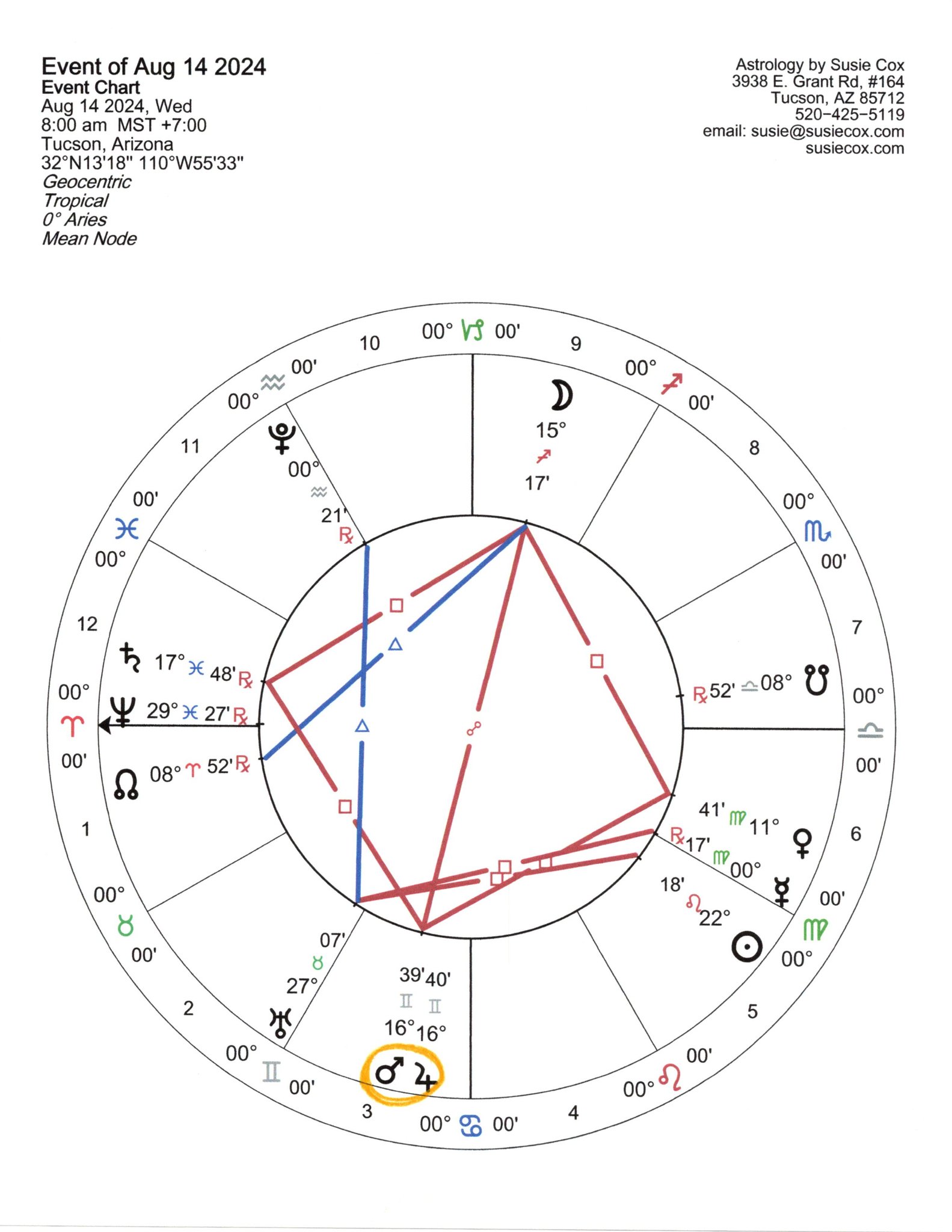 P.S. As I take this newsletter to press, it seems that Mars has already started his summer with the shooting at Trump's rally in Pennsylvania. Mars was exactly conjunct Uranus as that happened. Mars is now heading towards Jupiter.