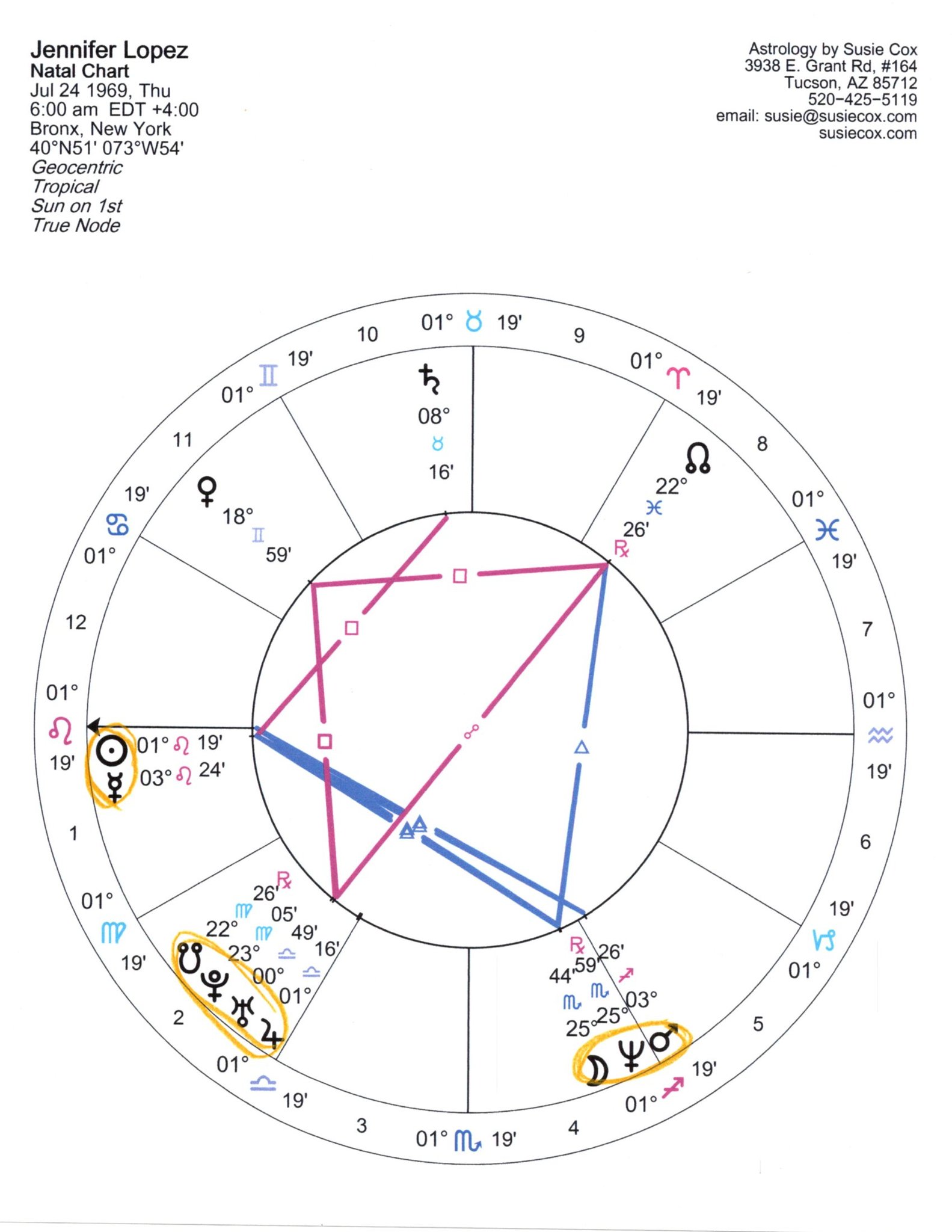 Now it’s time to look at her chart. Jennifer was born on July 24, 1969, in the Bronx, New York. Her Sun is in the sign of Leo, the entertainer! Her Moon is in sexy Scorpio.