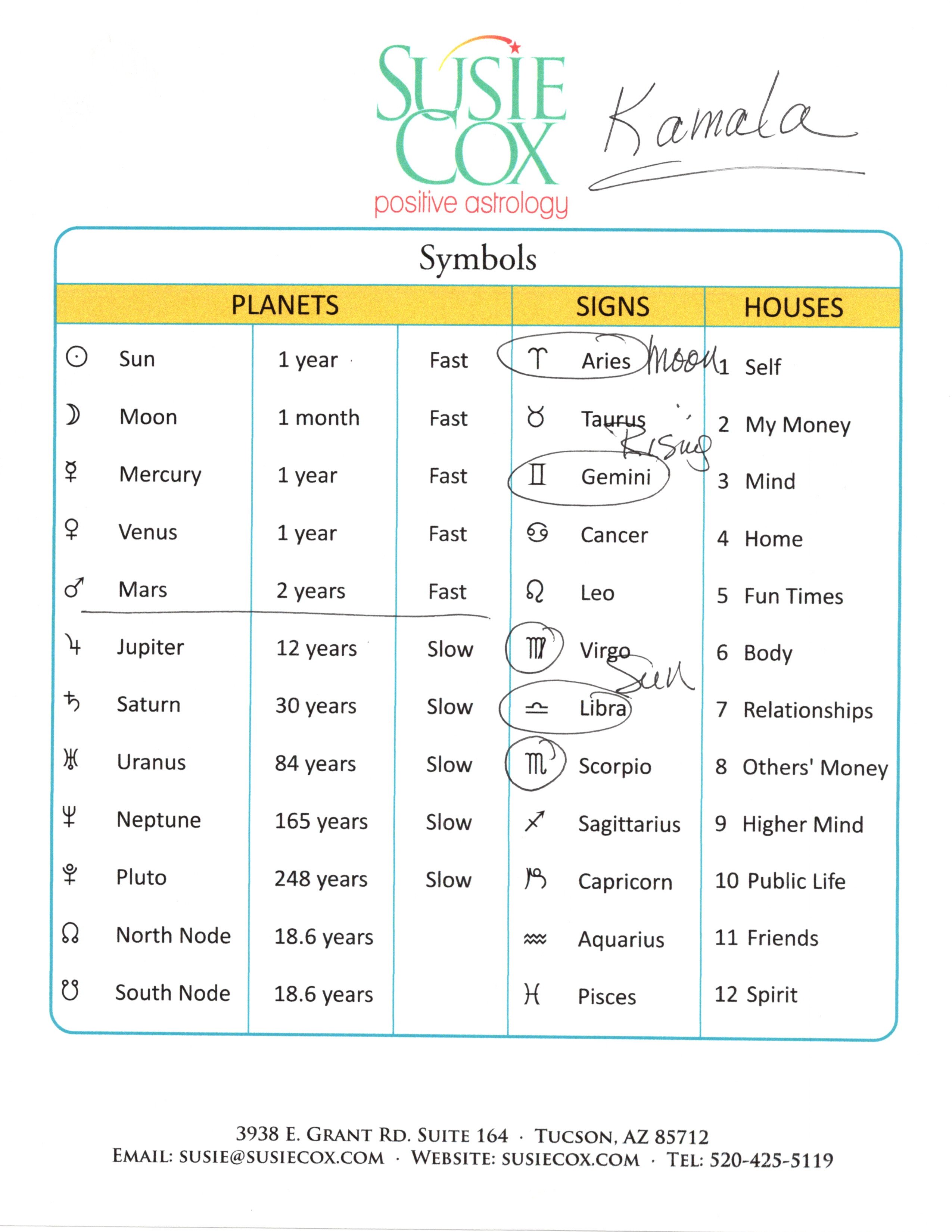 Let’s start with her Sun, Moon and Rising. Her Libra Sun is the sign of the diplomat, who is good at collaborating to get things accomplished. Her Full Moon in Aries is energetic and powerful. Kamala has a Gemini rising that shows her intelligence and wit.