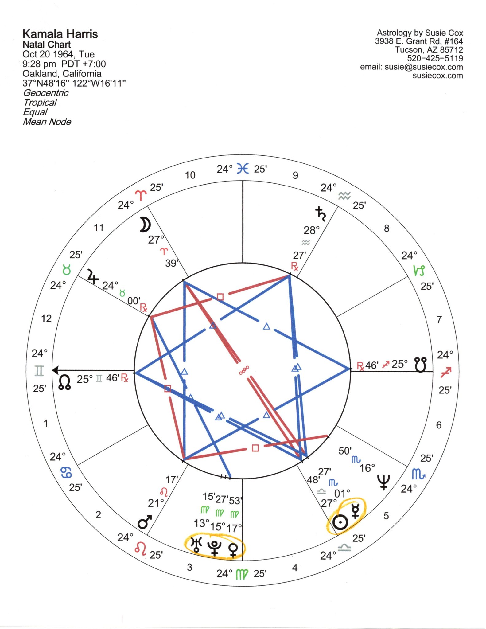 Kamala was born on October 20, 1964, at 9:28 pm in Oakland, CA. Her Sun is in balanced Libra. Her Moon is in fearless Aries, and she has a smart Gemini rising. She has an unusual chart for several reasons. She was born on an exact Full Moon in Aries. She also has the rare occurrence of having two perfect Grand Trines that form a six-pointed star with red lines connecting them. With 55,000 chart interpretations under my belt, I think this is the first time I’ve ever seen this planetary configuration.