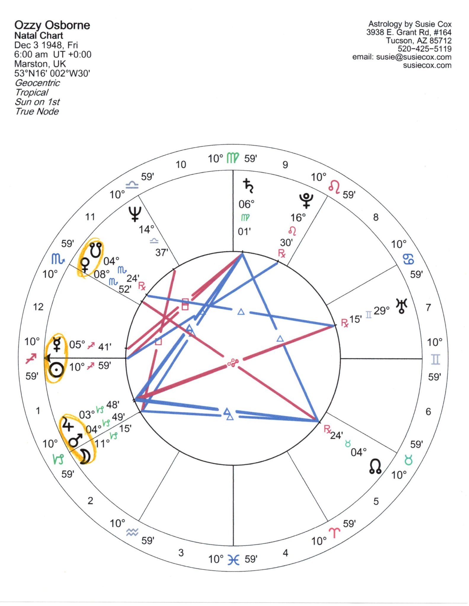 Ozzy was born on December 3, 1948, in Marston, England. Unfortunately, his time of birth is unknown, so I’m using the sunrise of that day, which means we don’t have his rising sign. Ozzy’s Sun is in outgoing Sagittarius with his Moon in accomplished Capricorn.
